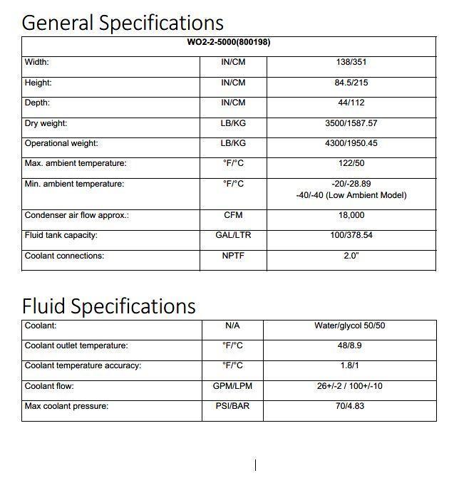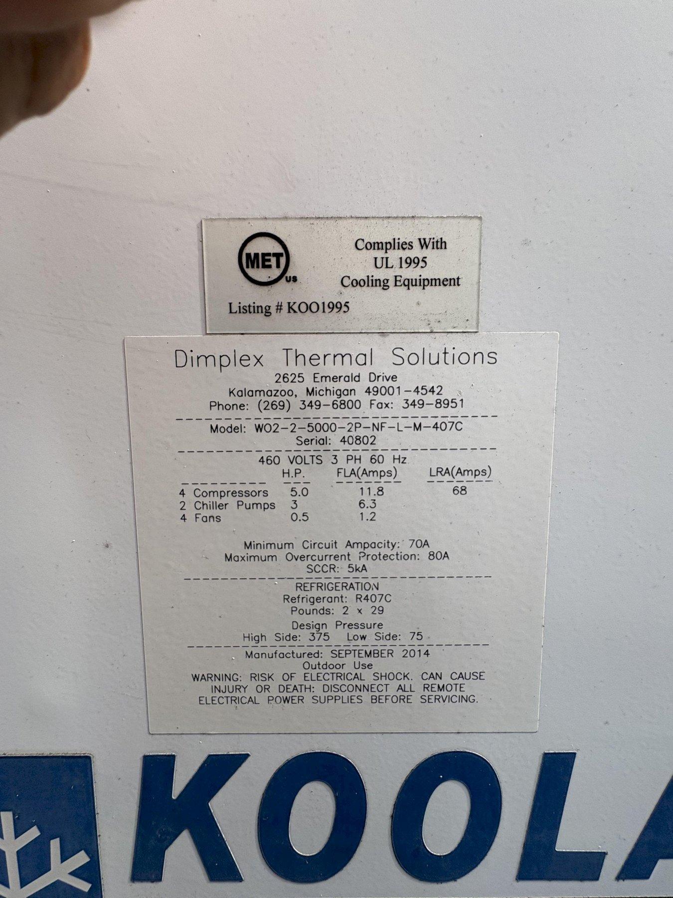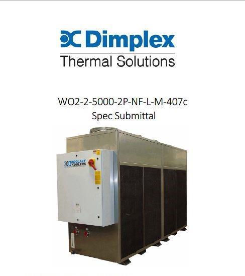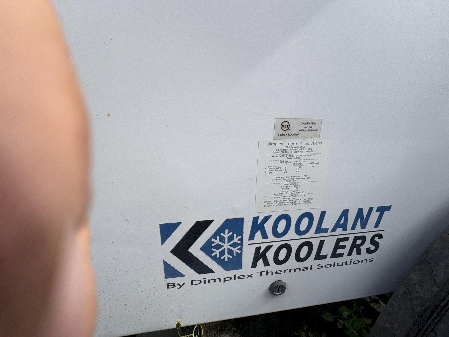 KOOLANT KOOLERS Dimplex Chiller, WO2-2-5000-2P-NF-L-M-407C, R407C, 20 Ton Condition: Used and in good working order. Manufacturer: Dimplex Thermal Solutions Power Req: 460vac, 3ph Model: WO2-2-5000-2P-NF-L-M-407C Serial: 40802