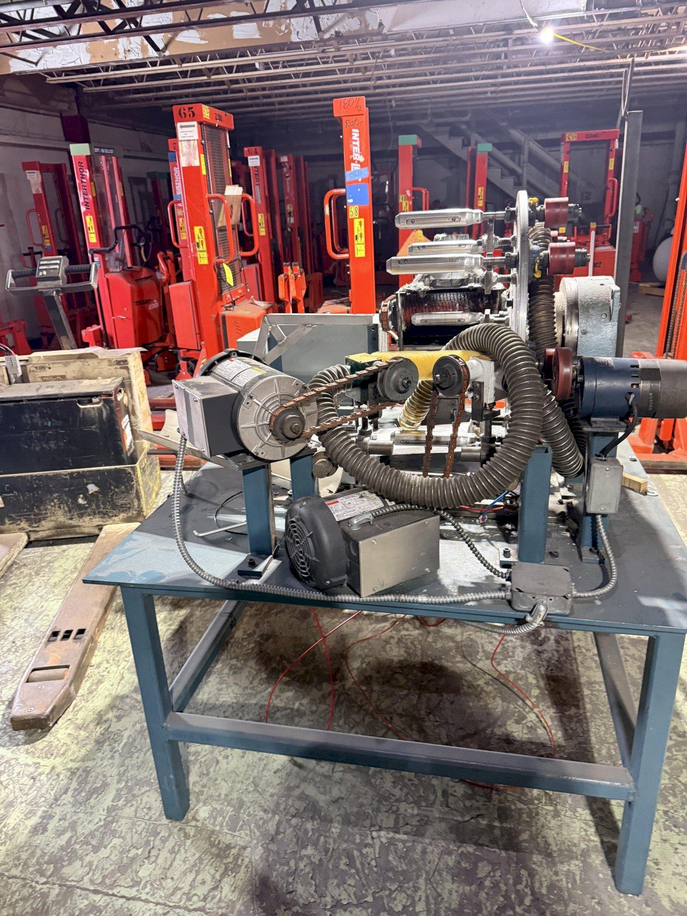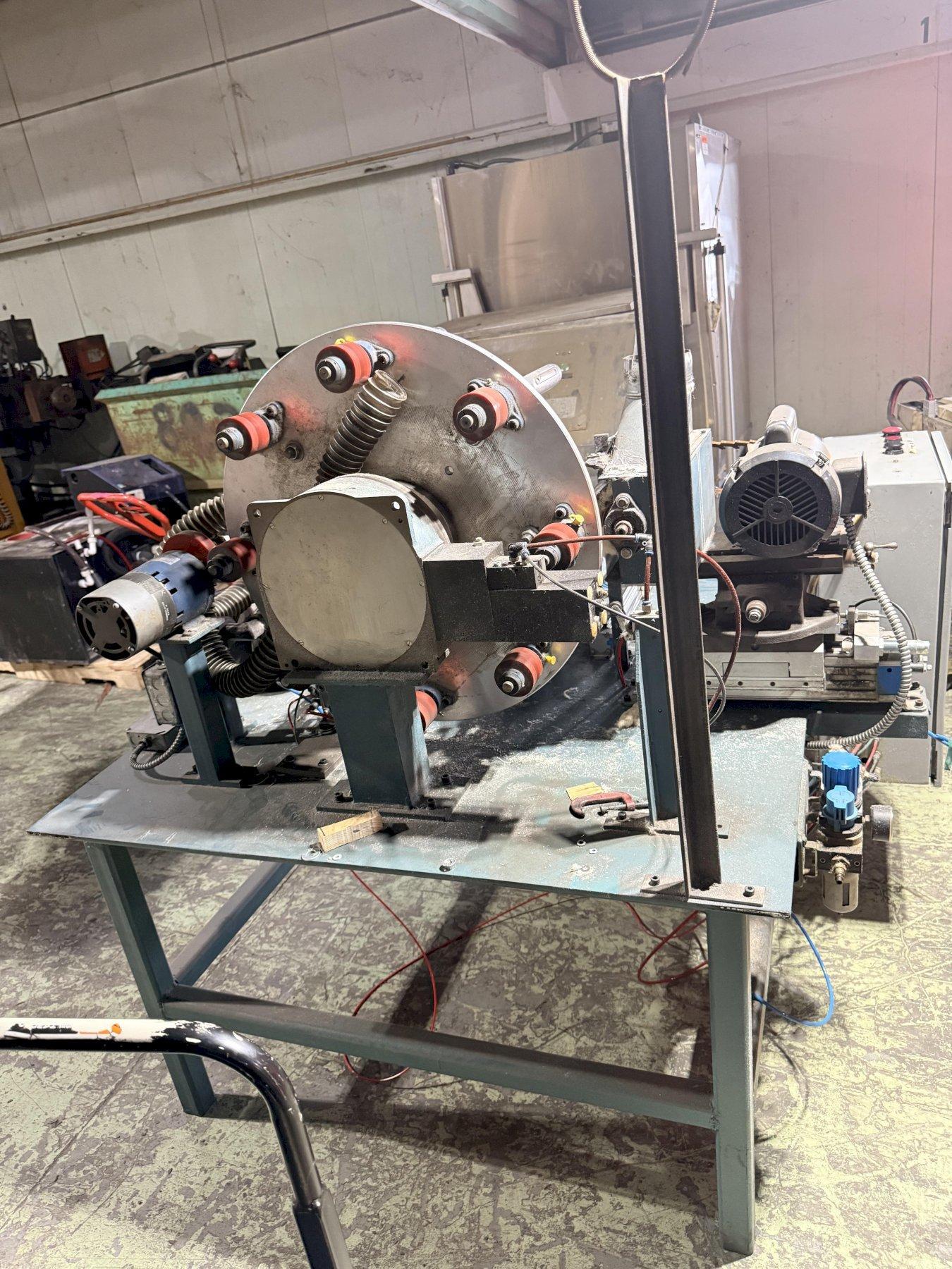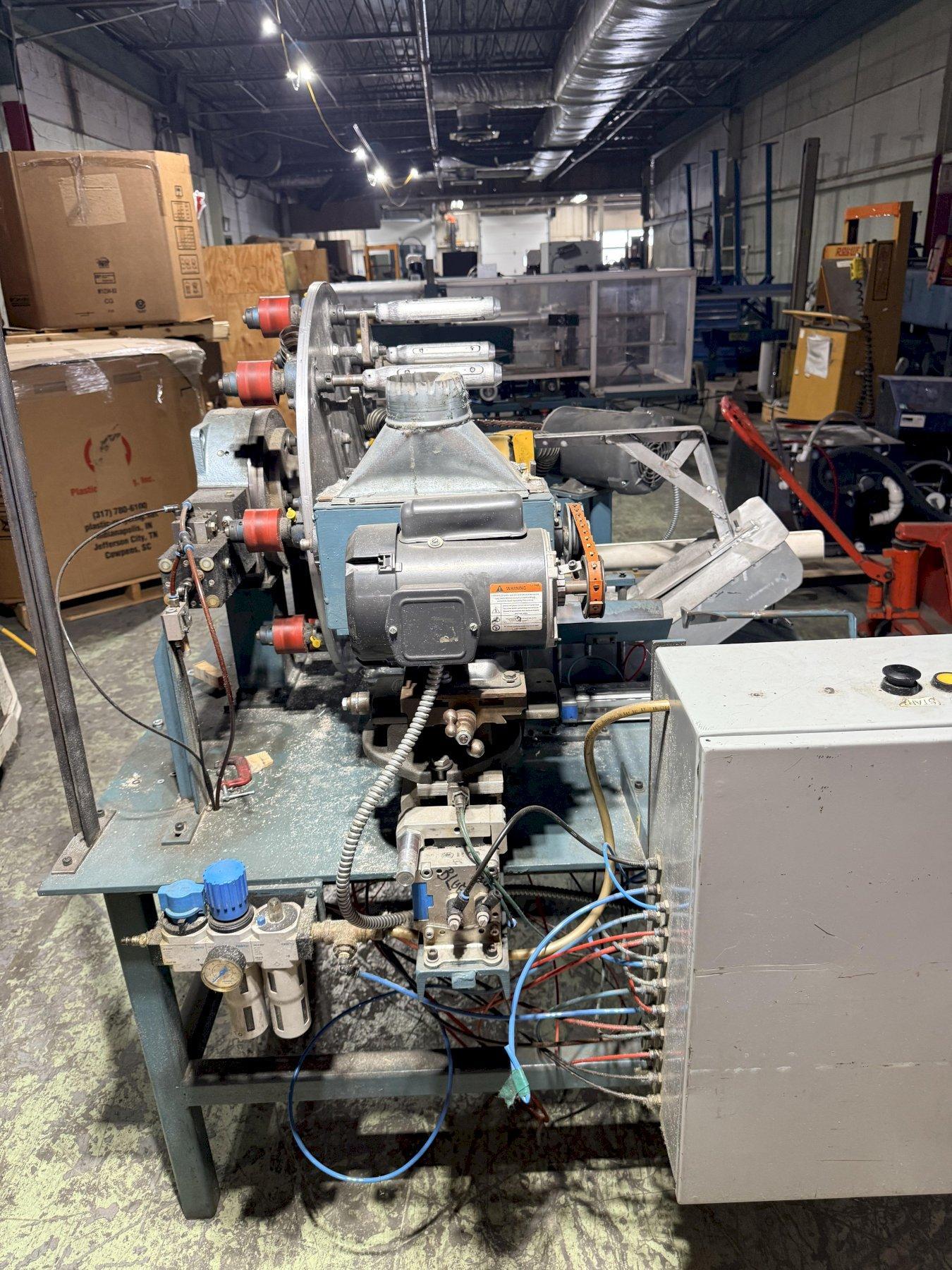 Multi-station rotary indexing paint roller finishing machine. Original design. Has carding and beveling stations installed. Used to finish paint rollers with a 1.5" ID. Can be modified to finish rollers of different IDs. Additional stations can be added based on desired finishing needs.