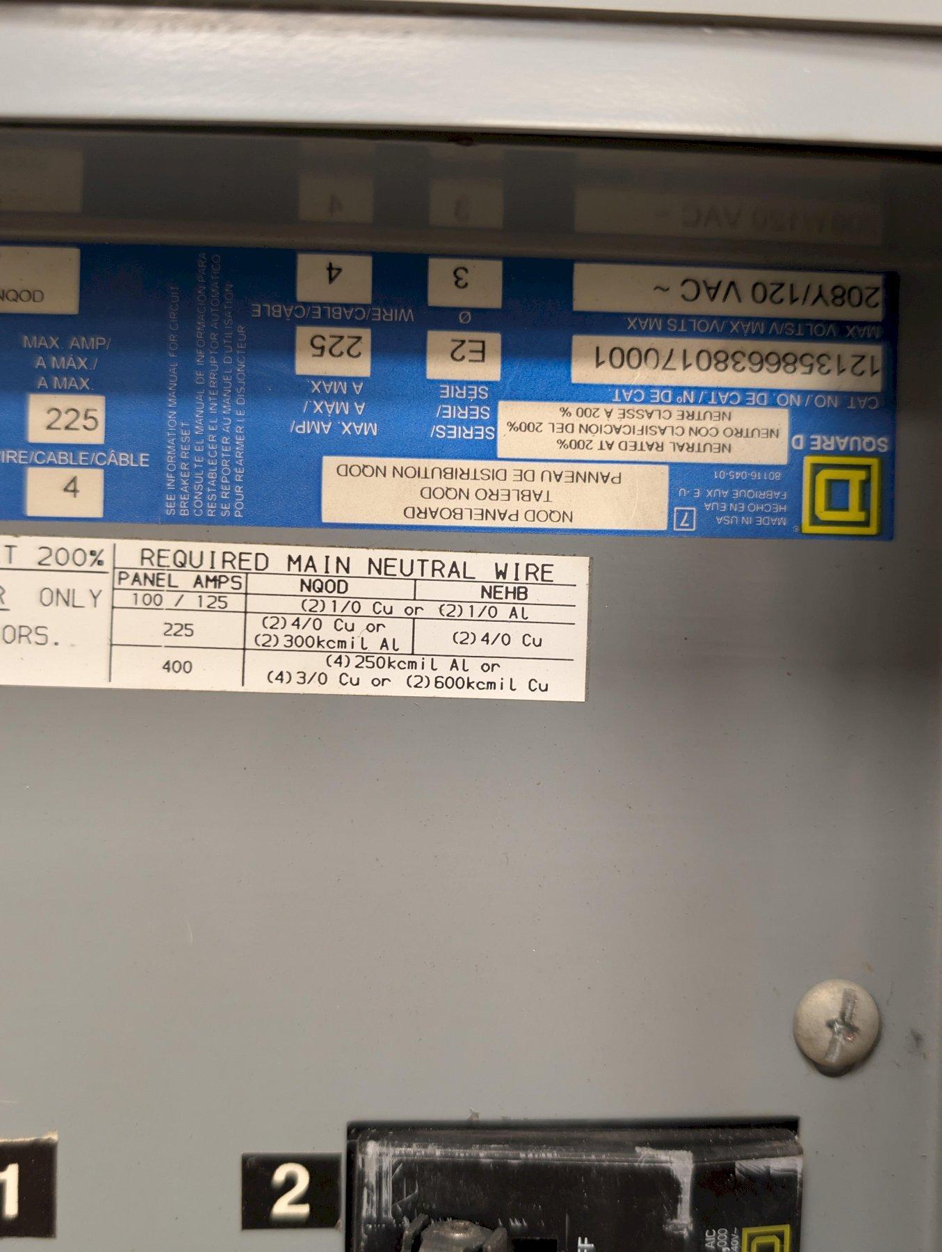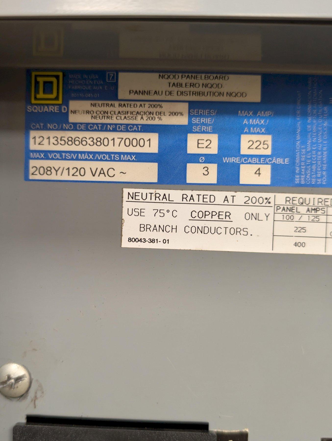 Up for sale is a Square D NQOD panelboard, rated for 225 amps and configured for 208Y/120V, 3-phase power. This unit is designed for commercial and industrial electrical distribution applications.